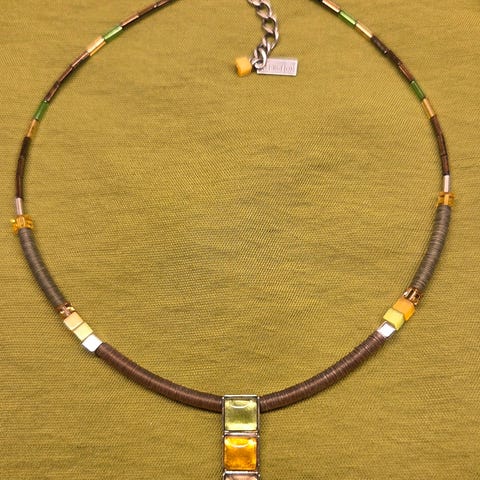 Halskjede laget av naturlig korall (YUSR) og turkise perler av howlitt, med perler dandert av rosetter i gull. Karabinlås og ringer er av gull. Dette er et utsøkt stykke kunsthåndverk.