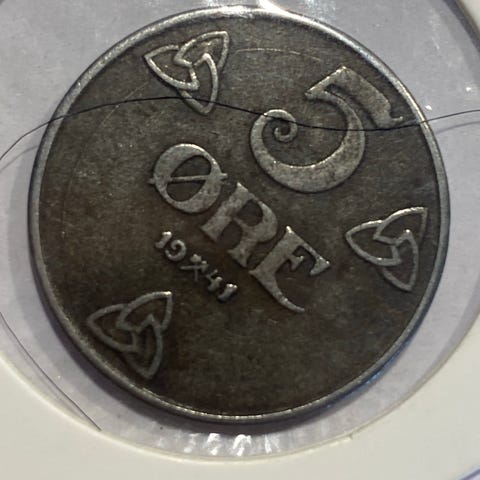 Norge 5 Øre mynt fra 1941. Mynten er laget av metall og viser verdien 5 Øre på den ene siden og Norges riksvåpen på den andre siden. Passer for samlere og de med interesse for norske mynter.