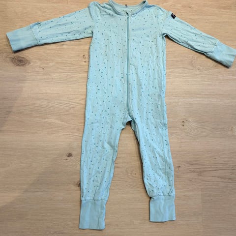 POP hel bomullspysj for barn i str. 98/104. Romslig i størrelsen. Vrangborden nederst på ermene og bena er ekstra lang og kan brettes ned etter hvert som barnet vokser. Den lange glidelåsen fra halsen til nederst på bena kan åpnes både ovenfra og nedenfra, noe som gir enklere skift.