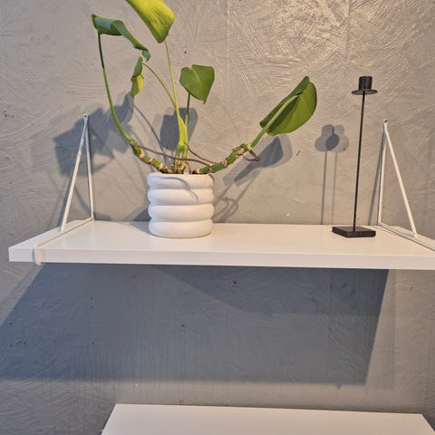 To stk. pent brukte hvite vegghyller med Pershult hylleknekter fra IKEA. Hylleknektene er i hvit metall. Selges fordi jeg ikke lenger har behov for de.