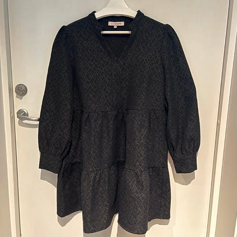A-View hverdagskjole i størrelse S, farge svart med mønster. Kjolen har lange ermer med volangdetaljer og er laget av lett materiale. Egnet som hverdagsplagg for kvinner.