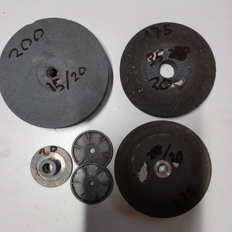 Flere runde slipesteiner i samme størrelse, solide og klare til bruk. Fint for hjemmelaget slipestativ, pussing, forming eller til gamle benkslipere. Selges samlet.