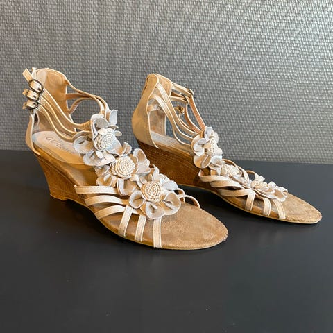 Selger et par blå sandaler med kilehæl og dekorative blomster foran. Hælen er ca. 7 cm høy og gir god komfort samtidig som skoene ser feminine og stilige ut. De har justerbare stropper med spenner og et design som passer perfekt til sommerantrekk, fest eller ferie.