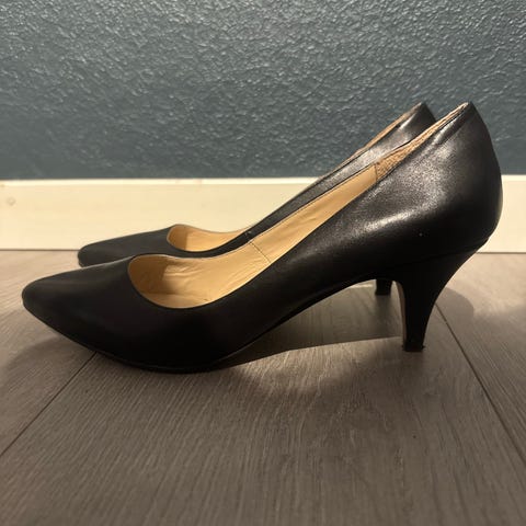 Svart pumps i ekte skinn, størrelse 41. Brukt kun én gang, så de fremstår nesten som nye. Klassisk spiss tå og komfortabel innsål gjør dem perfekte både til jobb, selskap eller hverdagsbruk. Et tidløst og elegant par hæler i svært god stand.