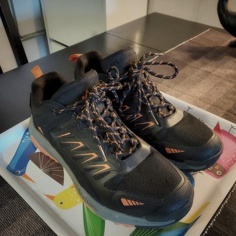 Asics gel - fujisetsu 3 gire-tex løpesko i størrelse 39, laget for løping. Skoene har svart overdel med oransje detaljer og solide såler med pigger for bedre grep. Materialet er slitesterkt og egnet for utendørs bruk på ulike underlag.