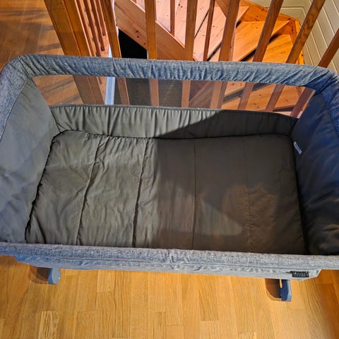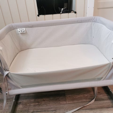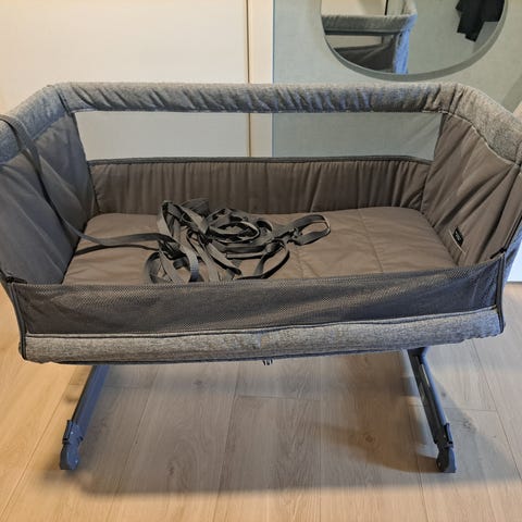Svært god seng som er pent brukt, ingen skader eller mangler. Mørkegrønt trekk. Mål på madrassen er 85x50 cm, 5 cm tykk. Trekket på senga er vasket. Den er enkel å montere, med kun 8 skruer og en umbrako. Den kan brukes til lett vugging i begge retninger.