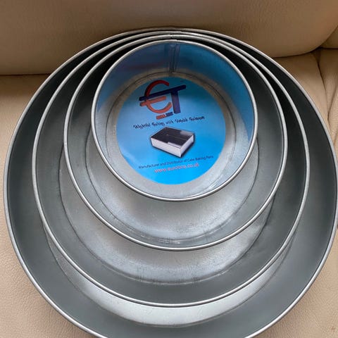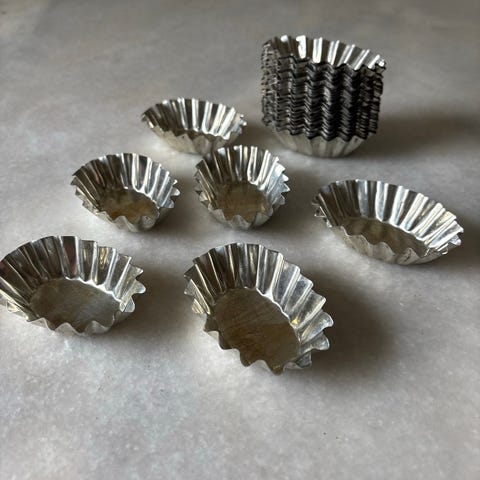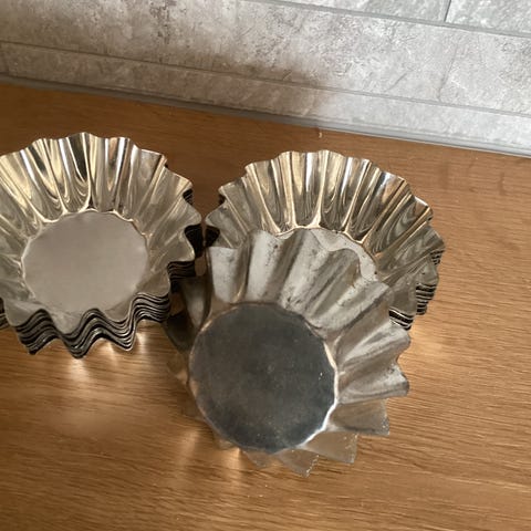 Kake bakeform sett i metall, inkludert flere små former med bølget kant og flate former. Egnet for baking av småkaker, muffins, eller andre bakverk. Materialet er metall, og settet består av flere enheter i forskjellige former og størrelser.