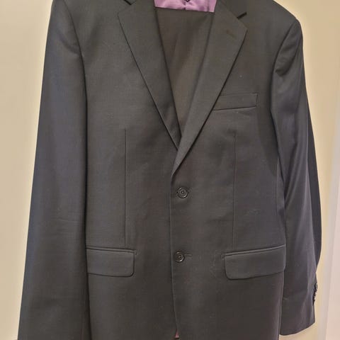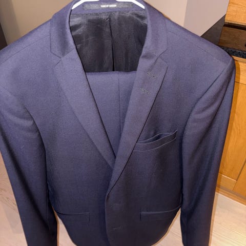 Blå dress med lyseblå «pin stripe».