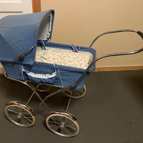 Retro dukkevogn. Ene festet til kalesjen nå fikses, men det er ikke stor jobb.