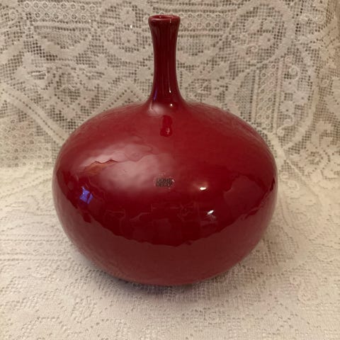 Dyp rød kulevase, viser alle tegn på å være håndblåst. Måler 23 cm høy og ca 13 cm på det bredeste. Ikke merket, så jeg har ikke klart å finne ut opphav på denne.