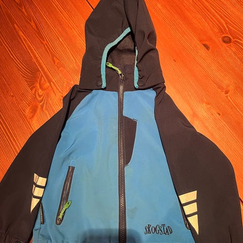 Skogstad barnejakke i størrelse 92 for gutt. Jakken har blå farge med beige og hvite detaljer. Den har hette med avtagbar pelskant, og man kan ta av hetten.