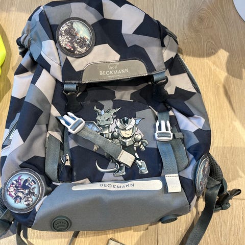 Meget pent brukt Beckmann ryggsekk sort. Lomme under med regntrekk.