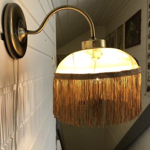 Dekorativ vegglampe satt sammen av svartmalt bakstykke og arm i metall, og kuppel i hvitt glass med dekor. Et ørbittelite nagg i kanten på denne. Kuppelen har en gang sittet på en flerarmet lysekrone, så den er en litt større type. Forholdsvis ny ledning med bryter og nytt, jordet støpsel. Lampen er 24 cm høy, den bygger ca 25 cm ut fra vegg, selges uten lyspære.