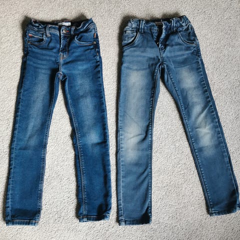 Name it Jeans i blå farge, størrelse 128. Laget av denimmateriale med klassisk knapp- og glidelåslukking. Hull på det ene kneet. se bilder.