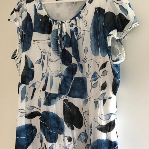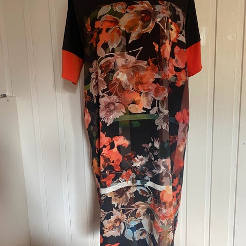 Nydelig fargerik lett kjole med svart bakgrunn. Silke forran og elastisk bomull bak. Veier nesten ingenting og er ikke gjennomsiktig eller krøllete. God form for å skjule mage og behagelig.