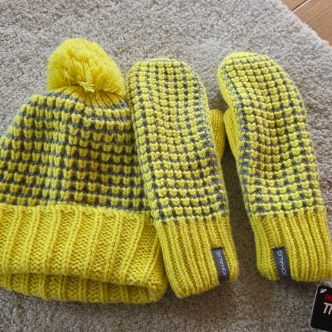 Lue, skjerf og votter i sennep farge, selges samlet for 500 kr. Lue og skjerf brukt et par ganger, som ny. Devold ullvotter er helt nye, ikke brukt.