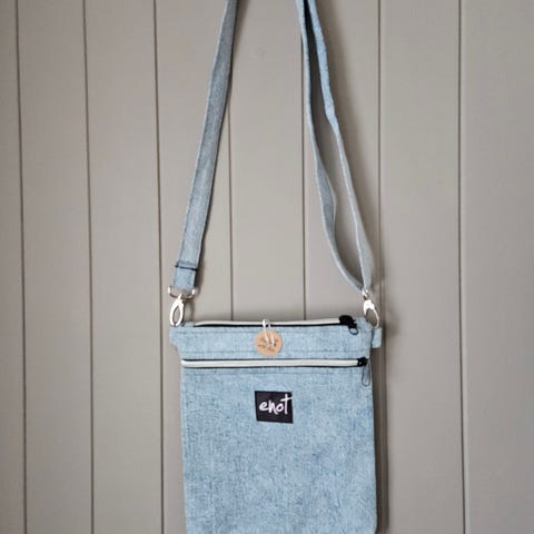 Stoff Veske i blå og svart farge. Vesken har to håndtak og en justerbar skulderrem. Den har en knappelukking øverst og et innvendig rom med glidelås. Materialet er stoff, og vesken passer til daglig bruk. B. 10 cm. L. 30 cm. H. 20 cm. (Redesign)
