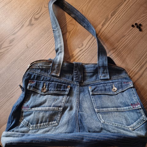 Stoff Veske laget av blå denimstoff. Vesken har flere lommer, inkludert en utvendig lomme og en innvendig glidelåslomme. Den har både håndtak og en avtagbar skulderrem for fleksibel bruk. B. 14 cm. H. 30 cm. L. 35 cm.
