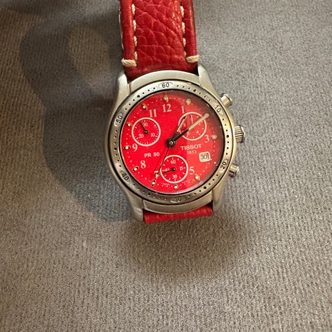 Klokken har multifunksjonsvisere med kronograf, svart skinnrem med røde detaljer.