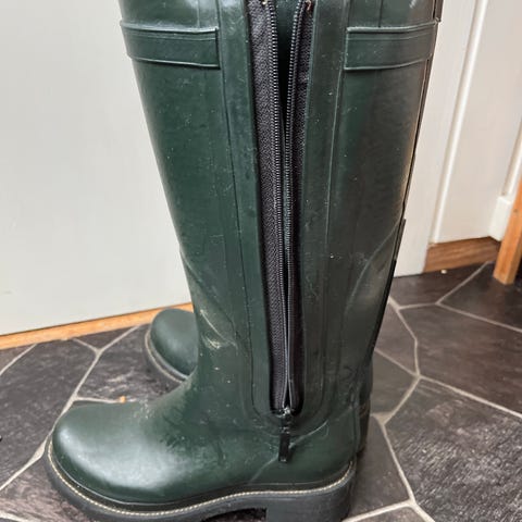 Ilse Jacobsen Hornbæk regnstøvler i størrelse 37. Støvlene er svarte og laget av vanntett materiale egnet for våte forhold. Modellen er håndlaget i Europa og har snøring foran for justering. Designet for både funksjonalitet og komfort ved bruk i regnvær.