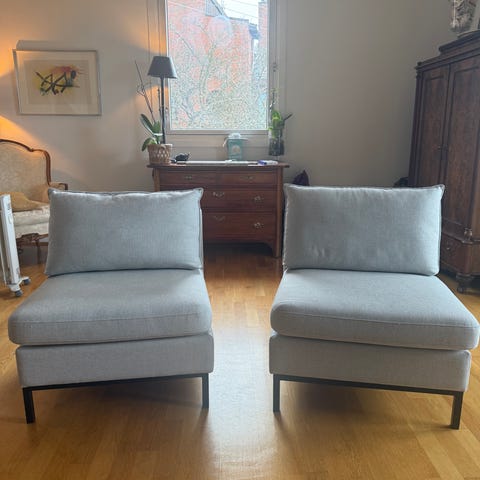 Stolene er trukket i blå cordfløyel med sorte stålben. De er svært behagelige å sitte på og laget av slitesterkt stoff av god kvalitet. Trekkene på putene kan tas av. 2000 kr per stol.