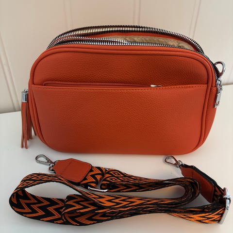 Skulderveske for dame i svart lakklær med sølvfarget kjede som stropp. Vesken har klaff med magnetlås og flere separate rom med glidelås for organisering av småting. Passer til mindre personlige eiendeler og kan bæres over skulderen eller som crossbody.