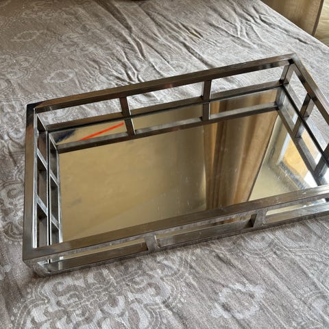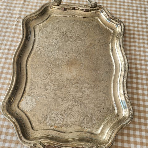 Dette er et dekorativt serveringsbrett med en hevet perforert og åpen kant.