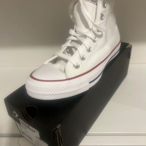 Converse Chuck Taylor All Star Høy Sneakers i hvitt canvasmateriale. Skoene er unisex og har størrelse 37.5. men er wide fit, så føles mer som 38-39. Designet med klassisk høy ankel, hvit farge med røde og blå detaljer. Egnet for ulike uformelle bruksområder.