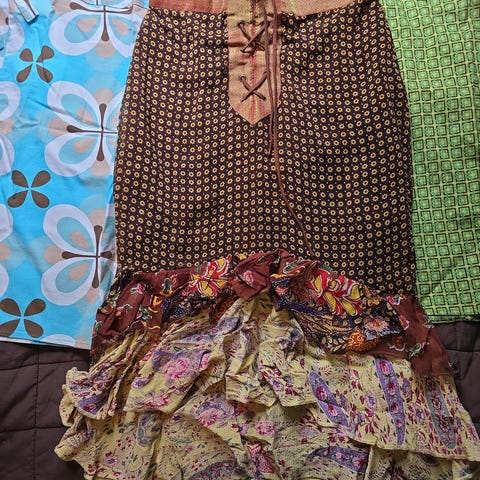 Kjøpt fra en på FINN som har laget skjørtet selv. Kun prøvd på for lenge siden. Obs! Har klippet lengden av litt som du ser på bilde 5, så trenger sikkert å sy sammen.