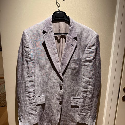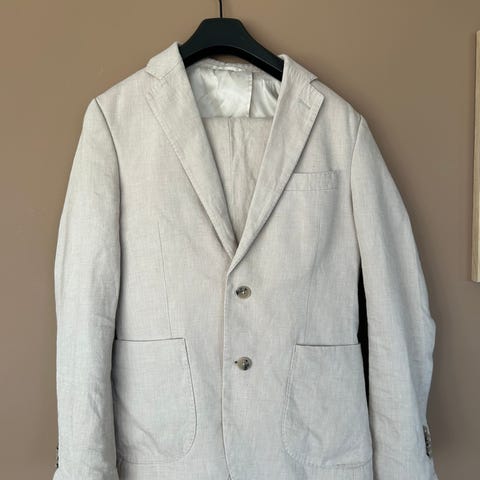 Lin dress m blazer og bukse i beige farge, størrelse M (str 48) for menn. Laget av linmateriale med to knapper foran, to lommer med klaff og knappdetaljer på ermene. Blazeren har en klassisk passform og er egnet for formelle og uformelle anledninger.