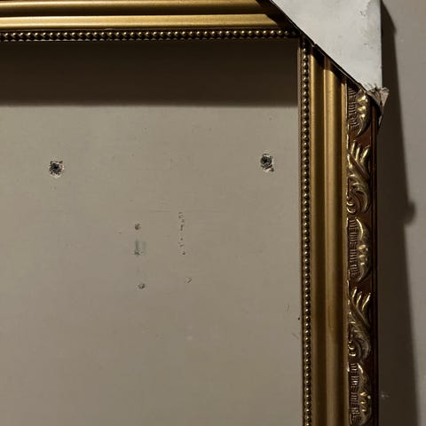 Håndmalt porselensflis med fiolmotiv som er innrammet i gullforgylt treramme. Bildet måler 16 cm x 20 cm og selges for kr 80,-