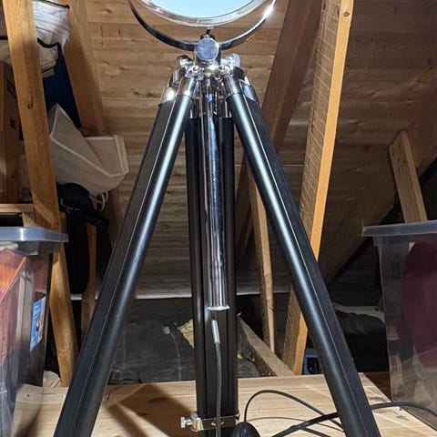Stor tripod gulvlampe selges. Den er et blikkfang i stuen og jeg har hatt masse glede av den. Fargen er svart med kromdetaljer. Kan brukes både høy og lav/slått sammen til 134 cm. Lampen er eldre og har noen bruksmerker, men det er ikke noe jeg har tenkt over når jeg har hatt den.
