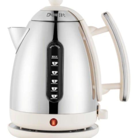 Hvit vannkoker i rustfritt stål. På/av-indikator. Lokk med knott. Vannstandsvindu. Skjult varmeelement. Brukt 1 sommer til utleie.