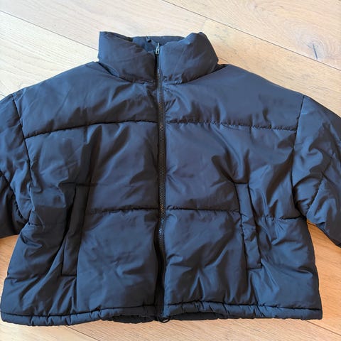 Y2K boblejakke fra H&M i størrelse XS for kvinner, farge svart. Jakken har et ytre lag i 100 % polyester med polyuretanbelegg, polstring i 100 % polyester, og fôr i 100 % polyester. Passer til kaldt vær og gir isolasjon og beskyttelse mot kulde.