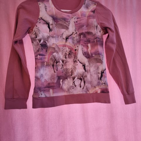 ONLY Genser for jente i størrelse 134, rosa farge. Genseren har rund hals og ribbestrikkede kanter ved ermer og hals.