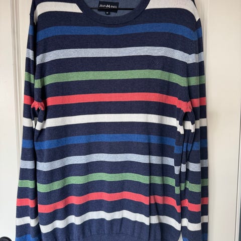 Samsøe Samsøe genser i størrelse M for menn. Genseren er marineblå med hvite horisontale striper og har knappedetaljer på skulderen. Laget i et mykt materiale, egnet for hverdagsbruk.