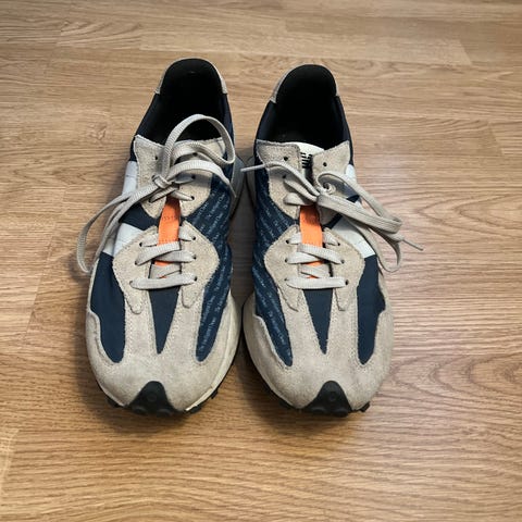 Lite brukt New Balance 327 Sneakers joggesko i størrelse 45.5 selges til en rimelig pris. Skoene har en kombinasjon av hvit og grå farge, med materialer som inkluderer tekstil og semsket skinn. Designet for generell bruk og hverdagslig komfort.
