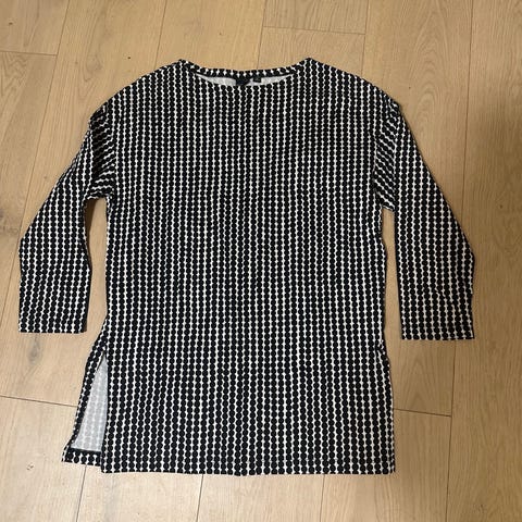 Pen genser fra Brandtex i str XL. Vid modell. Mønstret i svart og beige.