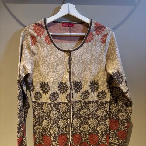 Oleana Cardigan i størrelse M for damer. Flerfarget med mønster i rødt, hvitt og blått. Laget i ullmateriale. Knappelukking foran og rund hals.