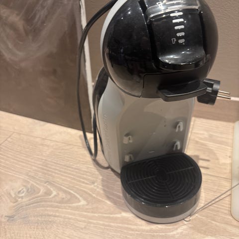 Dolce Gusto Genio S espresso maskin i grå farge. Maskinen er kompakt med en enkel kontrollpanel for å justere koppstørrelse og bryggeinnstillinger. Den bruker kapsler for å lage espresso og andre kaffedrikker. Passer for hjemmebruk.