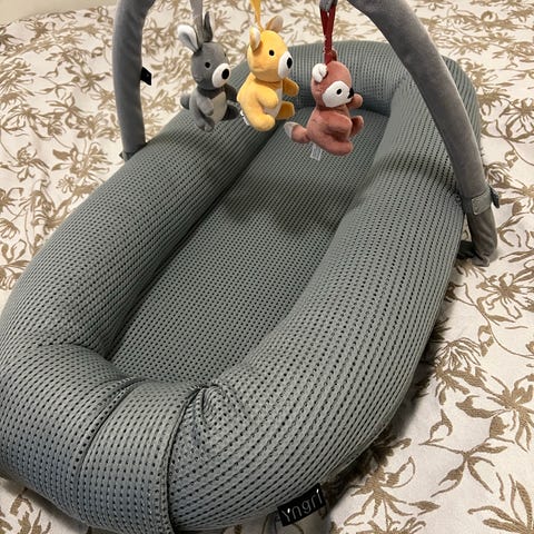 Yngri babynest med myggnett og lekebue. Lite brukt til 1 barn. Kjøpt ny av meg på barnashus til 999kr