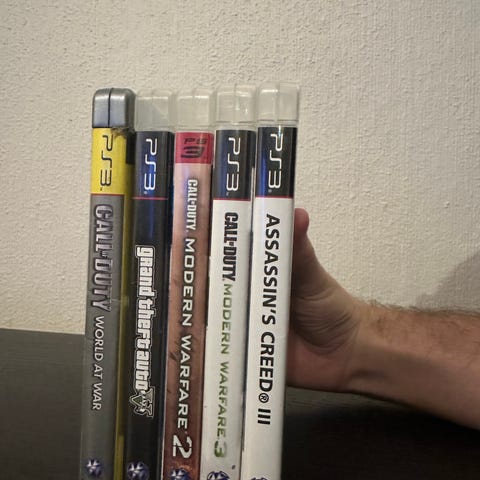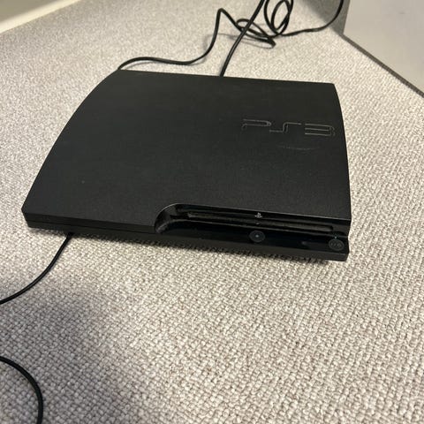 Sony Playstation 3 spillkonsoll i svart farge. Konsollen leveres med to svarte kontrollere. Kontrollerne er litt slitne, så trenger kanskje litt kjærlighet. Ladekabel til dem følger med.