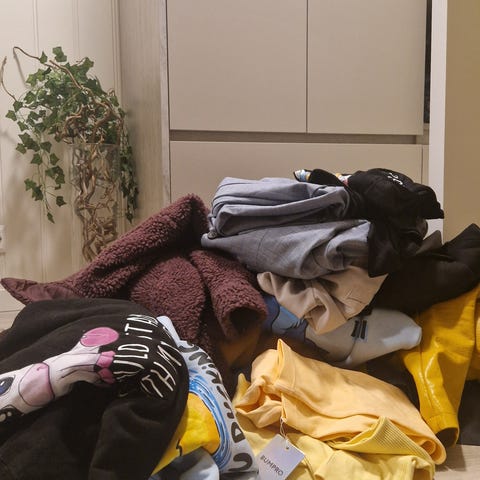 Olabukser, joggebukser, tykke gensere, tynne gensere, t-skjorter, topper, kjoler, skjørt, shortser og jakker.