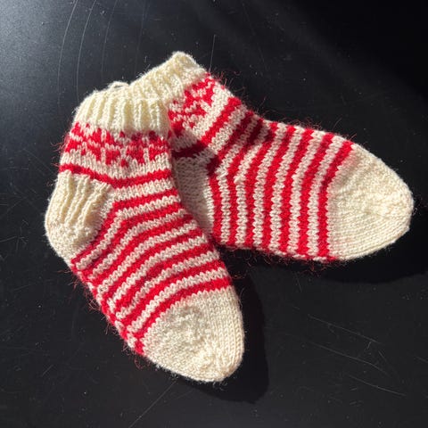 Jeg selger fem stk strikkede ullsokker/tøfler, og et par tøfler til baby. Disse er lite brukt.