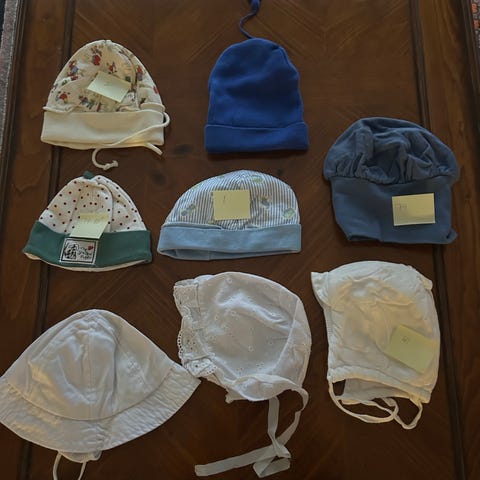 Jeg selger tre luer i ull til baby. Disse passer fra ca 1-3 mnd. Den mørkebrune luen har et lite hull (se bilde).