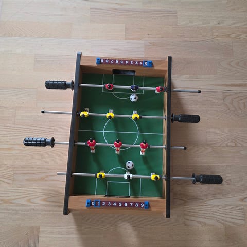 Bordfotballspill i tre med målestørrelse på 67x47 cm. Spillet har to lag med røde og gule spillere, samt to små fotballer inkludert. Håndtakene er svarte med metallstenger. Poengtavler er plassert på begge sider av bordet.
