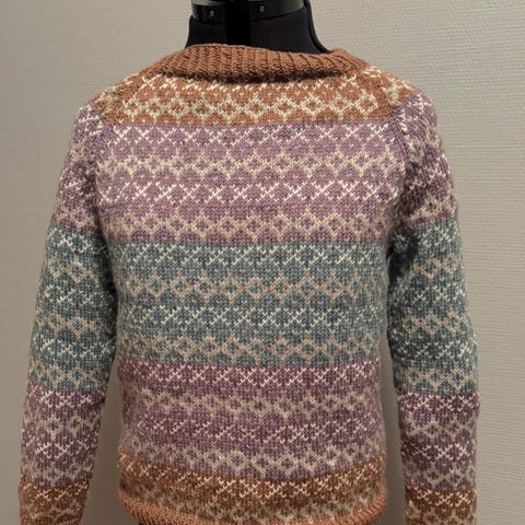 Katholt sweater strikket etter mønster fra Knitting for Olive. Genseren er strikket i str. 12 år, og det er brukt orginalgarnet; dobbel Merino fra Knitting for Olive. Genseren har aldri vært brukt, kun prøvd på ett barn, da dette var en teststrikk for Knitting for Olive i 2024. Genseren er skyllet opp etter at den ble strikket.