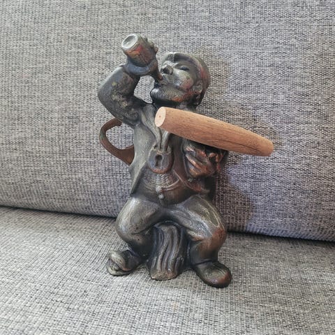 Fin figur i tre. Sannsynligvis stått i tobakk og sjokoladekiosk i gamle dager. Med lite brett som godsaker kunne legges på. Figuren er ca 75 cm høy