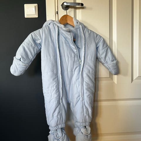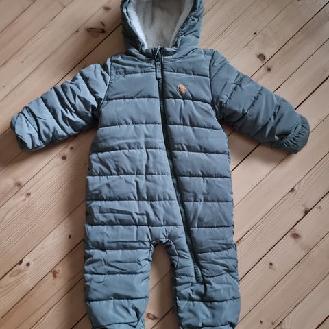 H&M Baby vinterdress for gutt i størrelse 74, lyse blå farge. Dressen har myk fôring (fleece). Den har knappelukking foran. Deilig foring i hetten. Hetten er festet med knapper og kan tas av. Søte detaljer foran på dressen. Passer til å holde barnet varmt i kalde værforhold. God til å ligge/sitte i vogn.