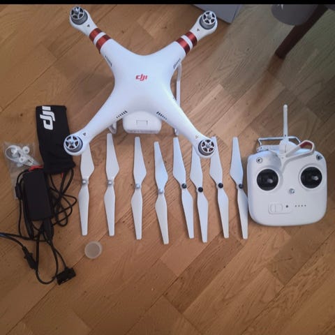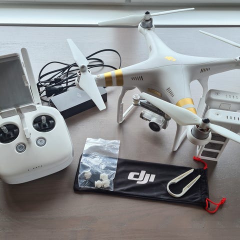 DJI Phantom Professional drone i hvit farge. Inkluderer en fjernkontroll med integrert skjermholder og en ryggsekk bag for transport. Dronen har fire motorer og er designet for profesjonell bruk. Ekstra propeller. Bil lader inkl. div annet ekstra utstyr.